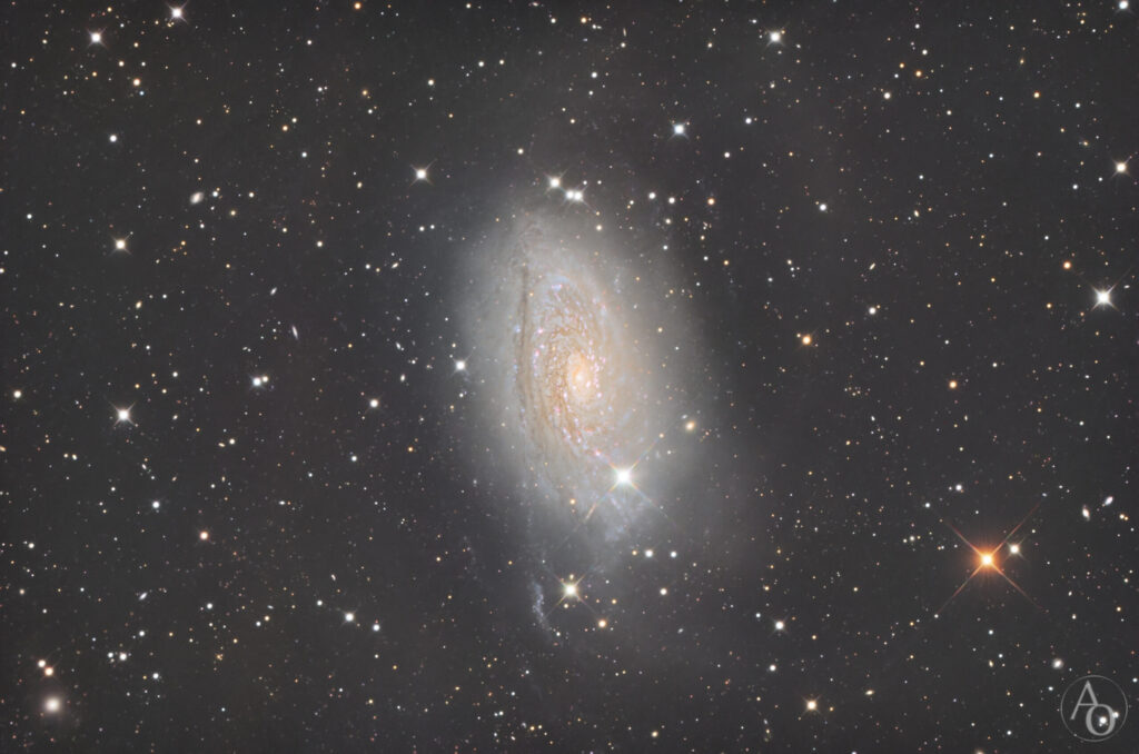 The galaxy M63, also cataloged as NGC 5055, is classified as an Sbc spiral galaxy according to the Hubble sequence, indicating that it has a moderately prominent central bulge and relatively open spiral arms.However, its most distinctive feature, which sets it apart from many other spiral galaxies, is its flocculent nature, a trait that we will analyze in detail in later sections.