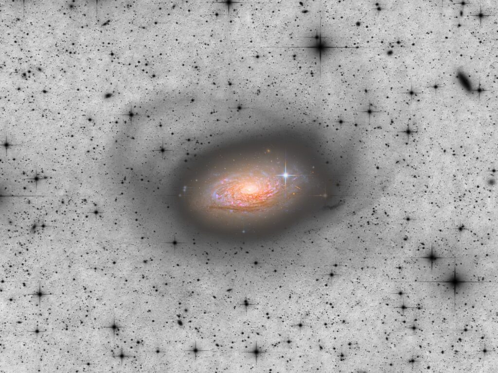 This stellar stream, poetically described as “a sunflower petal” in the title of the study, extends approximately 29 kiloparsecs (about 94,600 light-years) from the center of the galaxy, with a projected width of 3.3 kiloparsecs (about 10,800 light-years). Its morphology is consistent with the visible part of a “large circle” stellar stream originated by the accretion of a dwarf satellite galaxy of approximately 10^8 solar masses over the last few billion years. This discovery is particularly relevant because it provides evidence of an ongoing minor merger process, which could have implications for our understanding of the evolution of M63 and its flocculent structure.