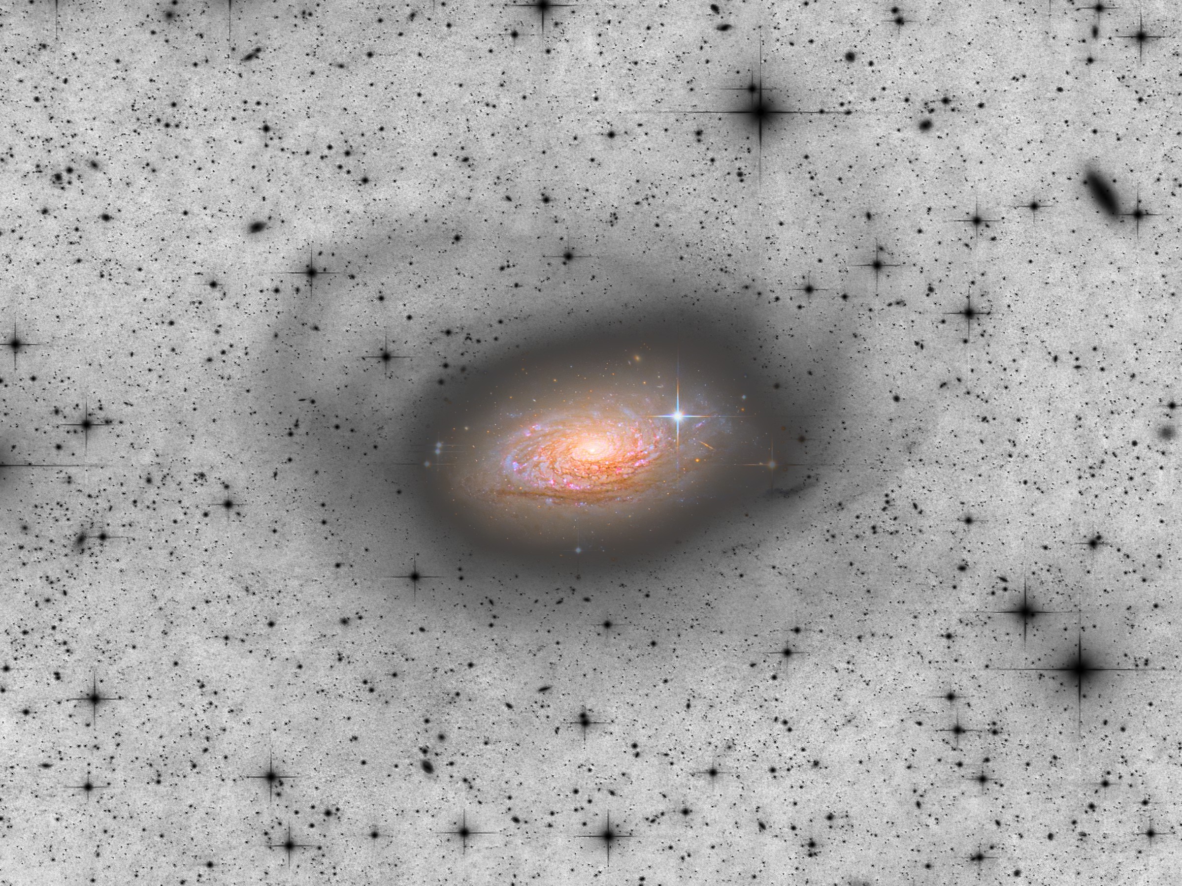 Beyond the visible disk, M63 has an extensive galactic halo, a low-density spherical region surrounding the entire galaxy. This halo contains ancient stars, globular clusters, and, as recently discovered, notable stellar streams. One of the most significant findings in this regard was documented in a study published in 2011 (Chonis et al.), which identified an arched structure with very low surface brightness in the halo of M63, consistent with being part of a stellar stream resulting from the disruption of a dwarf satellite galaxy.